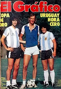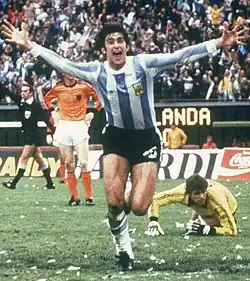 During his club career he won 43 caps for Argentina and scored 20 times. He represented his country in three World Cups in 1974, 1978 and 1982, winning the competition in 1978. He was the leading goalscorer in the 1978 tournament, scoring six goals in three braces: the first two in Argentina's first semi-final group stage match against Poland, another two against Peru, and the last two in the final against the Netherlands, which Argentina won 3–1. His second goal, in the 105th minute, was the game winner in extra time. However, in the same tournament, he notoriously stopped a goal with his hand in a second-round match against Poland.[7] This resulted in a penalty kick that was promptly saved by Ubaldo Fillol.[8] His goals in the 1978 World Cup Final were his last for Argentina at the age of just 23.