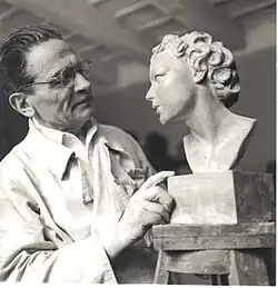 ![]() Sculptor Mario Sarto at work in his studio, with head of angel (1953) | |