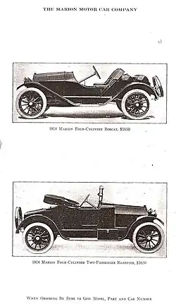 Marion was also used for prototype automobiles in 1901 by the Marion Automobile Company of Marion, Ohio, which later operated as a garage.[2] A Marion Flyer was listed in 1910 by the Marion Automobile & Manufacturing Company in Marion, Indiana, but no production was reported.[2]