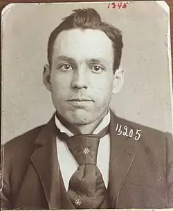 He was arrested in 1907 in Omaha, for the burglary of a storage house at Council Bluffs, Iowa. He was convicted and sent to the Iowa State Penitentiary in Fort Madison, Iowa[5] in March 1908, and upon appeal was released after serving one year.