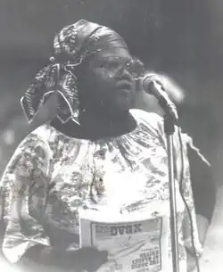![]() 1982 photograph of Stamps speaking at a Chicago city forum | |