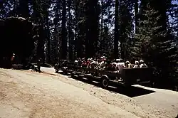 In 1969, Yosemite officials introduced trams to reduce traffic congestion around the giant sequoias, banning private vehicles in the upper grove. Each tram carried 50 passengers, offering a more sustainable way to access the trees and protect the environment.[18] The tour, which provided visitors with headphone-guided experiences among the giant sequoias, ran until 2014 when it was discontinued as part of the restoration effort that removed the asphalt roads from the grove.[19]