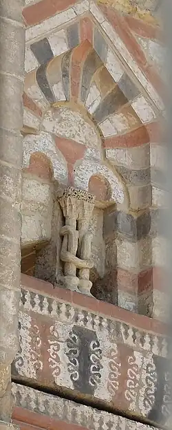 The frontal facade is tall and imposing, and features a surprising richness of ornamentation and colour.[3][2] Both here, on the exterior, and around the arches of the main hall/courtyard, are bands of carved stone that look like linked chains and serve to frame various elements of the architectural composition.[2] The entrance is set within a monumental recessed portal crowned by a vault or canopy of muqarnas (stalactite-like carvings) within a rectangular frame that projects higher than the rest of the building's facade; all of which is typical of Mamluk architecture.[2] The overall facade makes use of ablaq masonry (alternating dark red and light stone) masonry, but more elaborate ablaq patterns appear above the doorway. On both lateral (side) walls of the portal are two "roundels" of differing floral and geometric compositions created using red stone.[2] Outside the portal, two even larger roundel patterns of this kind appear above the windows on either side of the portal. Between these and the portal are keel-shaped niches (originating from Fatimid architecture) with radiating red and light stone, below which are inscriptions in Arabic (in either thuluth or naskhi forms), formed with red paste or stone, which together appear to form the shahada.[3][2] Further below these inscriptions are panels of "Square" Kufic script, formed with inlaid lapis lazuli blue tiles.[2] One unusual detail is also found above the doorway: here, set along the middle of a double window, are two small decorative columns with carved snakes wrapping around them, which could be a symbol of healing.[1]