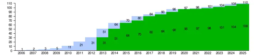 As of June 2025, the treaty has been ratified by 110[2] countries, many of which are large flag states in terms of the tonnage they transport. The European Union advised its (then) 27 members to ratify the treaty by 31 December 2010.[9] The EU Decision provides: "Member States are hereby authorised to ratify, for the parts falling under Community competence, the Maritime Labour Convention, 2006, of the International Labour Organization, adopted on 7 February 2006. Member States should make efforts to take the necessary steps to deposit their instruments of ratification of the Convention with the Director-General of the International Labour Office as soon as possible, preferably before 31 December 2010." As of January 2021, 23 countries had done so, while Croatia did so before it entered the European Union.[3] The convention entered into force on 20 August 2013 for the 30 countries that ratified it prior to 20 August 2013. For other countries, the convention enters into force one year after registration of their instrument of ratification. Nearly 1.2 million seafarers are affected by human rights laws, which include regulations on workplace protection, living conditions, employment, health and social security.[4]