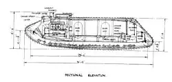 Already a bulky vehicle – the probable reason the Mark IX was selected as the basis for an amphibious tank – its displacement was improved by fitting drums at the front and sides. Long wooden boards were attached to the track links but at one side of the board only; as they reached the curve of the track they would project, acting as paddles. Pictures were made of a floating tank in Hendon Reservoir on 11 November 1918, the day of the Armistice. According to oral tradition, this vehicle was named The Duck but there are doubts as to its veracity. The photographs show that a large rectangular superstructure had been placed around the cab and from this superstructure pipes projected upwards, likely the outlets of bilge pumps. The vehicle was for the occasion manned by Navy personnel.[5]