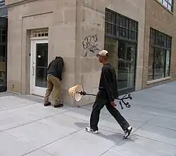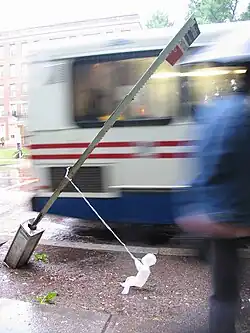 Mark Jenkins (born October 7, 1970) is an American artist who makes sculptural street installations. Jenkins' practice of street art is to use the "street as a stage" where his sculptures interact with the surrounding environment including passersby who unknowingly become actors.[1] His installations often draw the attention of the police.[2][3][4] His work has been described as whimsical, macabre, shocking and situationist.[5] Jenkins cites Juan Muñoz as his initial inspiration.[6][7]