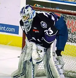 Owuya was also on loan during the 2009–10 season, first to Örebro HK and later Mora IK.[4] In the 2010 pre-season, Owuya was moved up to Djurgården's senior team, to compete with goaltender Stefan Ridderwall to be the first choice in the goal.[5] Ultimately, Owuya played in 32 out of 55 games in the 2010–11 Elitserien season, with a 2.18 goals against average and league-best save percentage of .927.[6][7] He also played in all of Djurgården's seven playoff games, with a 1.66 goals against average and a .924 save percentage.[8]