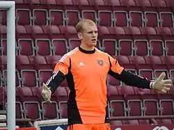 On his return from loan at East Fife, he was named on the bench again as a substitute against Auchinleck Talbot in the Scottish Cup.[7] On 30 January 2012, he was rewarded with a new two-year contract extending his stay at the club until 2014.[8][9] On 24 March 2012, he made his senior debut for the club, coming on as a half time substitute in a Scottish Premier League match against St Johnstone, replacing Jamie MacDonald in a 2–1 loss.[10] He went on to make his first start on 5 May, against St Johnstone.[11] He was on the bench when Hearts won the 2012 Scottish Cup Final.[12]