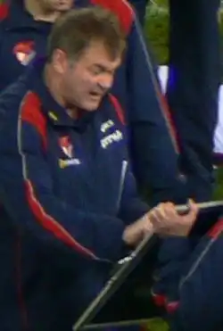Riley then joined the Melbourne Football Club in 2003 as an assistant coach under senior coach Neale Daniher. When Daniher resigned in the middle of the 2007 season, Riley was then appointed the caretaker senior coach of Melbourne Football Club for the remainder of the 2007 season from Round 14 onwards.[6][7] Melbourne under Riley won three of the nine games he coached to finish 14th on the ladder at the end of the 2007 season. Riley was however not retained as Melbourne Football Club senior coach at the end of the 2007 season and was replaced by Dean Bailey as Melbourne Football Club senior coach. Riley then left the Melbourne Football Club.[8]