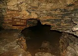 According to folklore, McDowell used the cave as a secret Confederate weapons storage cache during the American Civil War. McDowell was an ardent Southern supporter, and indeed had a stash of cannons and muskets, previously intended to aid the rebels in his home state of Kentucky in 1846, stockpiled at his St. Louis medical college, as evidenced when an angry mob gathered outside the building, mistakenly accusing McDowell of murder.[8][10] One of the former Confederates who likely had knowledge of the cave from his war service was the legendary outlaw Jesse James. James had ridden with Quantrill's Raiders and Bloody Bill Anderson throughout the Little Dixie area southwest of Hannibal. In September 1879, two weeks prior to the robbery of a train in Glendale, Missouri, the cave proved a ready and secure hideout for a few days rest. James even signed and dated one of the caves walls using a pencil.