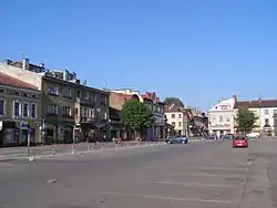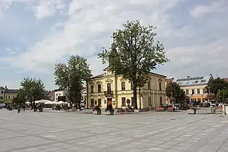 The Market Square (Polish: Rynek [ˈrɨnɛk]) in Nowy Targ is located in the center of the town. It was laid out for the first time in 1346, when the city was founded. There are 8 streets leading to the Market Square - two to each corner: Szaflarska St and Harcerska St to the south-eastern corner, John III Sobieski St and Tadeusz Kościuszko St to the north-east one, St. Catherine St and Szkolna St to the north-west one, and Kolejowa St and Casimir III the Great St to the south-west one. It has the shape of a rectangle with the dimensions of 138 x 110 m, which gives the area of 1.5 hectares (3.7 acres).[1]