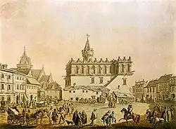 From the mid-18th century, the tenements were gradually rebuilt, but economic hardship altered their character. Many Renaissance arcaded tenements were replaced with simpler late-Baroque or Classical tenements. The southern side's arcades were demolished, and those on the shorter sides were walled up, with only three northern tenements retaining their arcades. Plot boundaries shifted due to mergers and subdivisions.[2] The most prominent building became the Sanguszko family's Classical two-story urban palace. Fires in 1792, 1813, and 1814 again damaged the town hall and surrounding structures. Rebuilt tenements often gained new interiors, facades, or additional stories. By the outbreak of World War I, most tenements were owned by Jewish residents.[2]