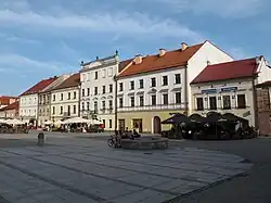 The Market Square remains Tarnów's most prominent public space, part of the downtown urban layout listed in the register of monuments.[5] The historic town hall stands at its center, surrounded by tenements built between the 16th and 19th centuries. The most significant are the Renaissance arcaded tenements in the northern row.[6] Every day at noon, the Tarnów hymn, composed by Stanisław Rzepecki, is played from the town hall tower.[7][8]