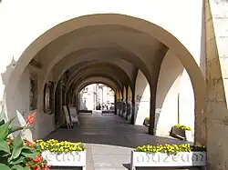 - Rosowska tenement (3 Rynek Street): A two-story tenement with an arcaded porch. Constructed in the 16th century with a vaulted arcade, it replaced an earlier wooden house. Later renovations removed the arcade and altered the second story. A major restoration from 1968 to 1970 reopened the arcade and rebuilt the second story. Since 2013, it has housed the Tarnów Regional Museum.[11] It was listed in the Lesser Poland Voivodeship's register of monuments in 2007.[12]