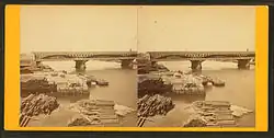 Early in the Revolutionary War, American General Israel Putnam built a pontoon bridge at the Middle Ferry site, made of floating logs bound together by rope. This was intentionally destroyed to prevent its falling into the hands of the British. The British Army built its own pontoon bridge at the site during the 1777-78 Occupation of Philadelphia. It washed away in 1780. Its replacement washed away in 1784.[2] That was succeeded by a plank-floor bridge also built on floating logs. Market Street was originally known as "High Street," and this floating bridge was the final link in the Philadelphia and Lancaster Turnpike.
