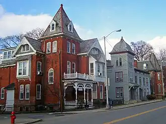 In the automotive era, Market Street was incorporated into US 9, the main route for drivers from New York City to Albany until the construction of the New York State Thruway and the subsequent rerouting of Route 9 onto a new expressway through the city. The houses became decrepit and were threatened during urban renewal efforts in the 1970s.[1] They were preserved instead, and added to the National Register of Historic Places in 1982. Today they have been redeveloped into commercial offices,[1] like the Hasbrouck House and Amrita Club nearby.