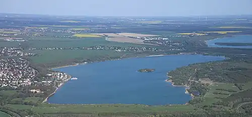 Adjacently in the south, there is another artificial lake, which is named Störmthaler See.[1] The two lakes, only separated by the Bundesautobahn 38, are part of the Central German Lake District.
