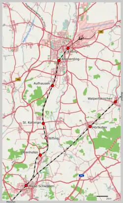 The line branches off the Munich East–Mühldorf line in Markt Schwaben and runs to the north. The next stop is Ottenhofen station. Wifling station was opened in 1922 and was closed on 22 May 1971. This is followed by St. Koloman station, opened on 1 June 1890, and Aufhausen station, which since 1972 has been incorporated in Erding. Altenerding station was opened on 1 May 1899 in the then independent municipality and a second track was built to allow trains to cross in preparation for the introduction of the 20 minute interval services on the Munich S-Bahn in 1981. At Erding Station there was formerly a siding leading to Erding Air Field. The line is single track throughout, with crossing loops at the stations of Ottenhofen and Altenerding. The terminal station of Erding has two tracks next to a central platform and train stabling sidings. Electrification of the line was completed on 7 September 1970. Since 1972, the line has been part of the Munich S-Bahn.[2]