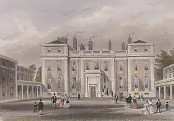 In 1708, John Churchill, 1st Duke of Marlborough was granted a 50-year lease of the site from the Crown Estate at a low rent from Queen Anne, which beforehand had been partly occupied by the pheasantry adjoining St. James's Palace, and partly by the gardens of Henry Boyle, Queen Anne's Secretary of State.[2][3] The Duke left his wife entirely in charge of the design and building of Marlborough House; she wanted her new home to be "strong, plain and convenient and good". The architect Christopher Wren and his son of the same name designed a two-story brick building with rusticated stone quoins that was completed in 1711. The stonework and ornamentation were built by Edward Strong the Younger a friend of Christopher Wren the Younger.[4] The Duke purchased the bricks cheaply in Holland while on campaign, and had them transported to England as ballast in the empty troop ships on their return journeys from depositing British troops.[5] Throughout the building process, the Duchess kept a close watch on even the smallest details and quarreled with the Wrens over the contractors they had hired. This led John Vanbrugh to joke that the Duchess had "the direction in chief to herself, with Sir Christopher Wren as her Deputy Surveyor."[2] Eventually she dismissed the Wrens and took control of the design herself.[6]