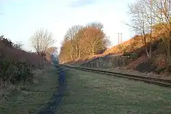 There was an anti-aircraft battery near High Marley Hill during World War II, and a drift mine which closed in the 1960s, as did the nearby Byermoor Colliery.[18] The 1951 OS map shows an opencast mine in the field beside the road, near the farm (marked on the map as Longfield House) and there is an embankment which runs parallel to School House Lane, from the site of the drift to the remains of a large retaining wall. This was presumably a loading point on the Bowes Railway, the trackbed of which is still visible, running alongside St. Cuthbert's Road. The presence of a large flat area of waste ground on the opposite side of the road to the wall is a possible indication there were railway sidings here. It is not known whether this loading point also handled the output of the opencast. The 1951 map also shows a terrace called Waggonway Row just beside the retaining wall. The outline of these houses can be seen from the air and is visible on Google Maps. The large house on School House Lane has several outbuildings which appear to have been associated with the drift. This would explain the presence of a sign on the wall of the building nearest the road which reads "UK Coal Monitoring Station." Exactly what this is monitoring is unclear, although it is likely to be mine water or gas. School House Lane forms the southern end of St. Cuthbert's Road, and vehicular access beyond the large house is prevented by a large concrete block which has been placed in the centre of the lane.