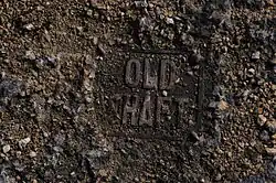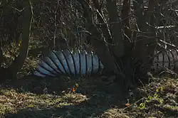 After closure, the headgears and other machinery at Marley Hill Colliery were scrapped and the buildings levelled. A hole was knocked into the wall of the square building which enclosed the top of the upcast shaft, and the rubble from the rest of the buildings tipped in to backfill it. This process having been completed, the building was demolished and a large concrete cap placed over the mouth of each shaft. There appear to be only two remaining buildings directly associated with the colliery. One of these is an airlock above a backfilled ventilation shaft from the Clockburn Drift, hidden away in Clockburn Wood near Whickham. The shaft was known as the Hollinside Shaft and actually pre-dates the drift as it was originally part of Axwell Park Colliery,[17] which was situated roughly a mile to the north-east. This colliery closed in 1954 after men from Marley Hill began working its remaining reserves beneath Hollinside and Gibside via the drift, at which point the NCB installed a fan to aid ventilation, these workings being some distance from the Shafts at Marley Hill Colliery itself. The other remaining structure is a curious rendered brick hut with double-walled construction and heavy steel doors, which stands in the middle of a field to the south of St. Cuthbert's Park. It is best to consult Google Earth to pinpoint the location. This is the colliery's former powder magazine, where explosives for use underground were stored. It was presumably constructed sometime in the first couple of years of the 20th century, as the bricks used, which bear the name "Blythe & Sons, Birtley Station" along with the letters ER (Edward VII) and the date 1901, are of the same type (stamped 1903 and 1904) used to construct Church Street, Cuthbert Street and Glamis Terrace. It has evidently been designed to direct the force of any explosion upwards, with its isolated location meaning that the resulting debris would not land on the surrounding houses or colliery buildings. It is (for unknown reasons) sometimes referred to locally as "the butterfly chambers" and fell out of use some time before the colliery closed, with one former Marley Hill miner recalling playing in it as a child. A new explosives store was built to replace it, this building being situated near the pit head baths.