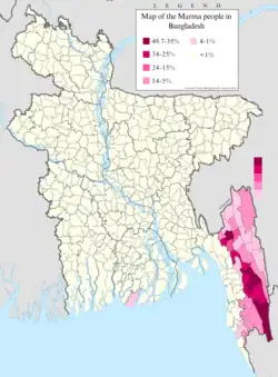 The Marma (Rakhine: မရမာ) are the second-largest ethnic community in Bangladesh's Chittagong Hill Tracts, primarily residing in the Bandarban, Khagrachari and Rangamati Hill Districts. They belong to the same community as the Rakhine people. There are three endogamous groups of Marma within the Magh Community which are known as i) The Thongtha, Khyongtha, Mrokpatha, ii) The Marma, Mayamma, or Rakhaing Magh, iii) The Maramagri, otherwise called the Barua maghs.[3]