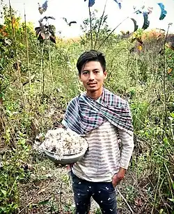 Marmas follow the Burmese calendar. They celebrate the New Year, called Sangrai (သင်္ကြန်), which begins on the first day of Bohag.[21] They make sangraimu, which is a form of traditional cakes. They take part in Sangrain Relong Pwe (သင်္ကြန်ရေလောင်းပွဲ; water pouring), where young Marma men and women spray each other with water. Sangrai is celebrated in three days, On the 1st day, called Painchwai or Akro, homes are decorated with flowers. On the 2nd day, Sangrai Akya, Marmas participate in traditional sports, dances, cultural activities and hold meetings regarding community issues. They also go to monasteries to participate in the Buddha statue's bathing (cleansing) ritual on this day. On the 3rd day, called Sangrai Atada, they cook a vegetable dish made out of more than 100 ingredients, called hangbong (ဟင်းပေါင်း; pachan in Bangla).[22]