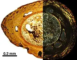 Cross section of a Marmorerpeton femur in normal transmitted (left) and polarized (right) light
