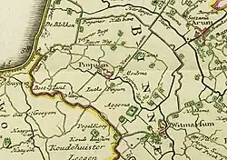 Around 1000 AD the Marne estuary was partly reclaimed by building a dyke out to the north of Pingjum, which was part of a dyke system totally surrounding Pingjum,. This was named Penjumer Gouden Halsbân. The dyke extended north from Govertsterp, parallel but east of De Blokken. It abutted the Griene Dyk that reached the coast at Dijksterbuorren. It then headed east until it met the Marnedijk (now called Groene Dijk) adjacent to some fields called De Wiken. The Marnedyk headed southeast (now called Schutedijk), and then cut off the arm of the Marne as it connected to the southeast shore north of Witmarsum.[1] The remains of the Marne river to the north of this new dyke, is called the Harnzer Feart. It was crossed by the Marnedyk with a sluice gate, the Kimswerter syl. This stream was diverted north to Harlingen, and the remanent heading to the coast was called Bidlersfeart. Bidlersfeart was crossed by the Griene Dyk at a sluice gate called Bantumer syl.[1] Each year on the 27 December the land on the new dykes was rented out at a party held at the church in Pingjum.[1]