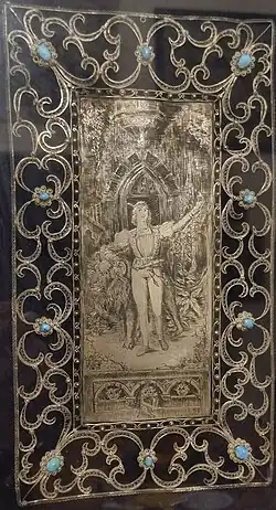 In addition to painting and theatre, Vahramian studied engraving and filigree at a time when the craft in Iran was male‑dominated. Surviving signed silver plaques (e.g. an interpretation of the Brothers Grimm's "Golden Bird" and military portrait miniatures) illustrate her adaptation of narrative and mythological subject matter into metalwork.[1]