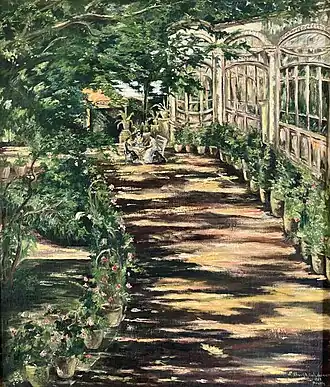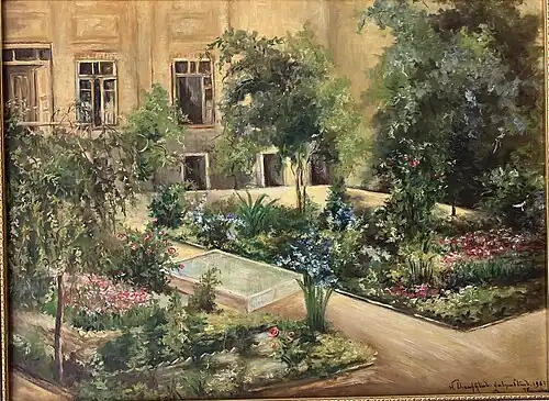 Marousia Vahramian was a versatile and prolific artist. Her painting Our Balcony depicts the balcony designed by her husband Grigor Vahramian Gasparbeg supported by Corinthian columns adorned by climbing plants at the base of the columns and a fusion of white roses on the left. This was painted in 2006 when she was 85 years old.