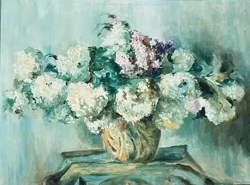 Marousia's passion for art never left her and she continued painting until her death. Not being dictated by patrons or by financial rewards, gave her the freedom to immerse herself in her art. The artist's keen eye for beauty and the appreciation for nature that so captivated her soul all her life is especially evident in her still lifes where she brings up the beauty of the flowers-notably lilacs, roses and chrysanthemums.