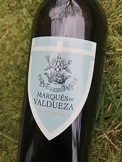 The title gave birth to the eponymous award-winning brand "Marqués de Valdueza", a high-end producer of olive oil, red wine, honey and vinegar managed by the current Marquesses of Valdueza and sold all over the world. Their products are elaborated in the 1,000 acre finca "Perales de Valdueza",[5] one of the two family estates in Mérida, the other being "Azagala", of 17,000 acres in Badajoz, serving mainly as a hunting reserve.[6] It has been praised as "one of the greatest olive oils" by the Financial Times, Vogue, Tatler, Fortnum & Mason, The Guardian and several other institutions.[7][8][9][10][11][12]