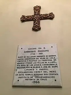 - ^ In full, Spanish: Don Ambrosio [Bernardo] O'Higgins [y O'Higgins], primer Marqués de Osorno, primer Marqués de Vallenar, primer Barón de Ballinar, Virrey del Perú, caballero de la orden de Santiago (Ricardo Donoso, El Marqués de Osorno: Don Ambrosio Higgins, Santiago, Publicaciones de la Universidad de Chile, 1942 p.53).