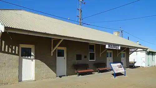 Marree station opened on 7 February 1884 at what was then known as Hergott Springs as the terminus of the Central Australia Railway when it was extended from Farina. The line was extended to Coward Springs on 1 February 1888. The town and railway station were renamed as Marree in 1917.[1][2] In 1891, the line was extended north to Oodnadatta, ultimately reaching Alice Springs in 1929.[3]