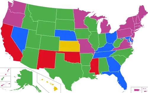 When at least one of the marriage partners is under the general marriage age, the marriage is considered underage. Sixteen states completely ban underage marriage: Connecticut, Delaware, Massachusetts, Minnesota, New Jersey, New York, Pennsylvania, Vermont, Michigan,[2] Rhode Island, Washington,[3] Virginia,[4] New Hampshire,[5] Maine,[6] Oregon,[7] and Missouri.[8] The other states may require the underage partner to obtain either parental consent, judicial authorization, or both, or rely on "exceptional circumstances". The minimum underage marriage age, when all mitigating circumstances are taken into account, commonly ranges from 15 to 17. Five states do not allow a person over 21 to marry an underage person. As of April 2024, four US states do not set any minimum age for marriage.[9]