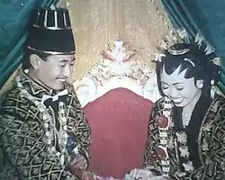 The traditional wedding ceremony is carried out according to local customary rules. Indonesia has many tribes, each of which has its own wedding ceremony tradition. In a mixed marriage, the bride and groom usually choose one of the customs, or sometimes the two customs are used in separate events.[9]