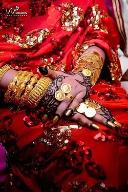On the day of the wedding, the groom and his male relatives and friends gather at the bride's family home to ask for her hand in marriage. This event is known as the "shayla," and it involves negotiations between the two families. Once the bride's family has agreed to the marriage, the groom is allowed to enter the bride's home, and the couple is officially engaged.[9] Shila is the first ritual/celebration. This is the night where female relatives from both the bride and groom's side gather together and bring gifts for the bride. Presents contain gifts bought from the groom for the future wife – she gets a big suitcase full of dresses, shoes, cosmetics, and other accessories.[12]