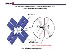 The idea of Marpost was then picked up by Leonid Gorshkov, one of the main designers of the RKK Energia (Raketno-Kosmicheskaya Korporatsiya – Rocket-Space Corporation) company, the leading Russian space developer and builder of human spaceflight hardware.[3] Gorshkov proposed to use the space complex called MEK (Mezhplanetniy Ekspeditsioniy Komplex, or Interplanetary Expeditionary Complex), that was already developed and designed by RKK Energia. The projected cost would be $14–16 billion and the period of realization would be 12–14 years. The elements of MEK were initially proposed to be launched by the Energia heavy booster. Later however, in order to lower the cost of the mission, the elements of MEK were proposed to be launched by a Proton or Angara rocket. The overall mass of MEK is estimated at 400 tons. The flight from Earth orbit to Mars would be powered by ion thruster engines.[4]