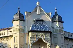 The first and second floors have identical arrangements. Here too, three apartments are set up, two in the east wing and one in the west wing. The rooms in the central bay, located above the commercial space, with access to the balconies, are part of the apartments in the west wing.[9] The balcony on the first floor is supported by consoles decorated with female figures and plant motifs. It has rounded pilasters and columns supporting the second floor balcony and is decorated with floral motifs. The second floor balcony has simple pilasters and columns. Above it and on its roof is the stylized "tree of life". The balcony is framed by two bay windows that continue with towers. Both above the balconies and on each facade there is a pediment. The entire building is decorated with female figures and animal and plant motifs: butterflies, rams, fish, grapes and flowers.[3]