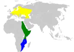The marsh warbler winters mainly in south-east Africa, from Cape Province north to Zambia and Malawi. It makes use of a range of well-vegetated habitats, from moist scrub to dense thickets and woodland edge, at altitudes up to 2400m.[7] Marsh warblers tend to migrate from Europe to Africa via the Middle East, with many crossing Arabia and arriving in Africa on Sudan's Red Sea coast. Adults usually leave their breeding grounds soon after their young are independent, with their offspring following about two weeks later. On the Red Sea coast most birds arrive from mid-August to mid-September, with numbers of adults peaking in August and of young birds in September. Birds tend to spend much of the autumn somewhere in north-east or east Africa, before continuing south to arrive on their wintering grounds in December or January.[7]