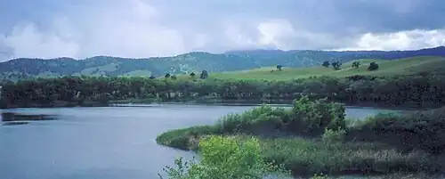 The Marsh Creek watershed drains about 100 square miles (260 km2) of the eastern slopes of Mt. Diablo and the neighboring portions of the Black Hills. Its upper tributaries are intermittent and small perennial streams which flow northwesterly until the creek turns east at Marsh Creek Springs. The creek was dammed downstream from the Springs in the 1960s, forming Marsh Creek Reservoir. The dam is south of Brentwood and north of the intersection of Marsh Creek Road and Camino Diablo Road.[4] Major tributaries are Briones, Dry, Deer and Sand Creeks. Briones Creek, which drains the undeveloped Briones Valley, flows into Marsh Creek at Marsh Creek Reservoir, which lies in Marsh Creek State Park (California). Dry, Deer, and Sand creeks all flow into Marsh Creek within the city limits of Brentwood.[5] The creek is largely channelized in the lower watershed, and includes a drop structure near the city of Brentwood that appears to be a complete passage barrier. The lower stretch of the creek includes 11 miles (18 km) from the outfall of the Marsh Creek Reservoir into the western Delta at the Big Break Regional Shoreline area of the Sacramento–San Joaquin River Delta northeast of the city of Oakley.[6]