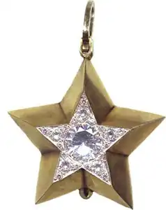 The decoration is a five-pointed gold star with smooth dihedral rays on the obverse. On top of the gold star there is a smaller five-pointed star made of platinum. In the center of the platinum star there is a 2.04-carat diamond. In the rays of platinum star there are twenty-five 0.91-carat diamonds. The total diameter of the gold star is 42 millimetres (1.7 in) and it weighs 35.1 grams (1.24 oz). It is connected to a moire ribbon in the same way as the large star.[2] About 370 Small Marshal's Stars have been produced.[2]