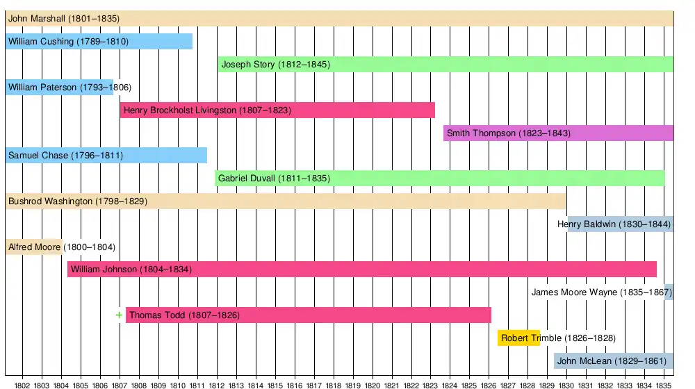 The Marshall Court began with Marshall and five Associate Justices from the Ellsworth Court: William Cushing, William Paterson, Samuel Chase, Bushrod Washington, and Alfred Moore. President Thomas Jefferson appointed William Johnson to replace Moore after Moore resigned in 1804. In 1807, Jefferson appointed two more justices, as Paterson died and Congress added a new seat for an Associate Justice. Jefferson successfully nominated Henry Brockholst Livingston and Thomas Todd. President James Madison appointed Gabriel Duvall and Joseph Story in 1811 and 1812, replacing Cushing and Chase. Madison had nominated Alexander Wolcott to replace Cushing, but the Senate voted him down. President James Monroe appointed Smith Thompson to succeed Livingston in 1823. President John Quincy Adams successfully nominated Robert Trimble to replace Todd in 1826. Trimble died in 1828, and Adams's nomination of John J. Crittenden was blocked by the Senate. Instead, Trimble was succeeded by John McLean, who was appointed by Andrew Jackson. In 1830, Jackson appointed Henry Baldwin to replace Washington, and in 1834, Jackson appointed James Moore Wayne to replace Johnson. In 1835, Jackson nominated Roger Taney to succeed the retiring Duvall, but the nomination was denied by the Senate. Marshall died in 1835, and Taney was instead nominated to replace Marshall as Chief Justice. Taney was confirmed in 1836, beginning the Taney Court.