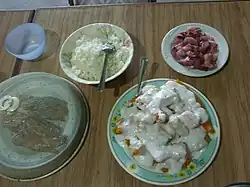 In Marshallese culture, a kemem is a celebration party that commences upon a child's first birthday.[5] At kemems it is traditional for a plethora of Marshallese and other various foods and dishes to be served, and along with food consumption, guests are typically encouraged to take some sort of household item from the home of the party.[5] In Marshallese culture, a family's generosity is sometimes considered as relative to the family having a lessened amount of material items left after the kemen is over.[5]