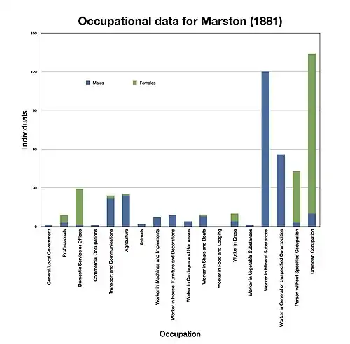 In 1881 the primary occupation (making up 12.4% of the total population) was "Worker in Mineral Substances". This large section of employment would have been due to Marstons extensive salt mine. At this time period workers in this industry where all male- 23% of males worked in this industry in 1881.