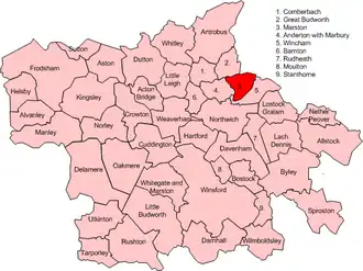 Historically Marston was a Township in the Great Budworth Parish (Bucklow Hundred, SJ 6776) and became a Civil Parish in 1866.[10] Between 1837 and 2009 Marston had been part of 5 Registration districts- Northwhich (1837–1974), Vale Royal (1974–1998), Cheshire Central (1998–2007), Cheshire (2007–2009) and Cheshire West and Chester (2009+).[11] In 1889 Marston's area was reduced by 272 acres due to a boundary change- Wincham, east of Marston, gained this area which included 18 individuals as well as Jackson's and Barber's Farm.[12] Marston had a population of 538 according to the 2011 census.[13]