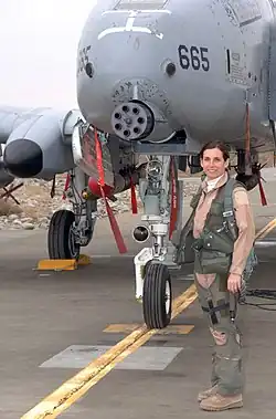 McSally then completed Replacement Training Unit for the A-10 Thunderbolt II at Davis–Monthan Air Force Base and was assigned to an operational A-10 squadron that deployed to Kuwait in January 1995.[8][9] During this deployment, she flew combat patrol over Iraq in support of Operation Southern Watch, enforcing the no-fly zone over southern Iraq and becoming "the first female U.S. fighter pilot to fly in combat and the first woman to command a fighter squadron."[8][10]