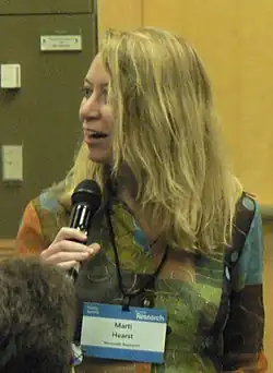 Marti Alice Hearst is a professor in the School of Information at the University of California, Berkeley. She did early work in corpus-based computational linguistics, including some of the first work in automating sentiment analysis,[1] and word sense disambiguation.[2] She invented an algorithm that became known as "Hearst patterns"[3] which applies lexico-syntactic patterns to recognize hyponymy[4] (ISA) relations with high accuracy in large text collections, including an early application of it to WordNet;[5] this algorithm is widely used in commercial text mining applications including ontology learning. Hearst also developed early work in automatic segmentation of text into topical discourse boundaries, inventing a now well-known approach called TextTiling.[6]