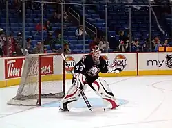 Biron started his junior ice hockey career on the Beauport Harfangs of the Quebec Major Junior Hockey League (QMJHL). He made his NHL debut with the Buffalo Sabres on December 26, 1995.[3] An emergency call-up with the Sabres' top three goaltenders all injured, Biron became the fourth-youngest goaltender to start a game in NHL history, surrendering four first-period goals in a 6–3 loss to the Pittsburgh Penguins.[4] After posting a 5.04 goals against average (GAA) with no wins and two losses during his fill-in stint, he was sent back to the QMJHL to develop further. After the 2000–01 season, he was a consistent goaltender for the Sabres as his play in the crease improved drastically.[5]